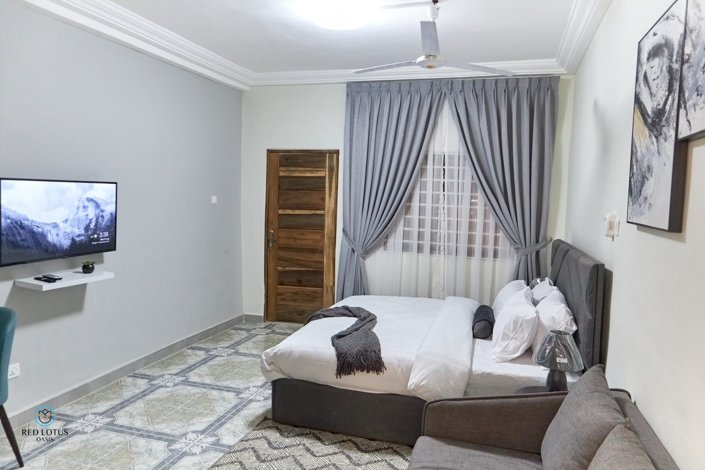 Welcome to your cozy vacation home in Ghana! This newly renovated Executive studio apartment at Red Lotus Oasis is fully equipped with modern amenities to ensure your long or short stay is comfortable and enjoyable. Conveniently located in the heart of Accra, the cozy ambiance of this tastefully furnished apartment is the best choice for guests searching for a combination of charm, peace, privacy, comfort and serenity. Book your stay and experience true comfort and convenience.